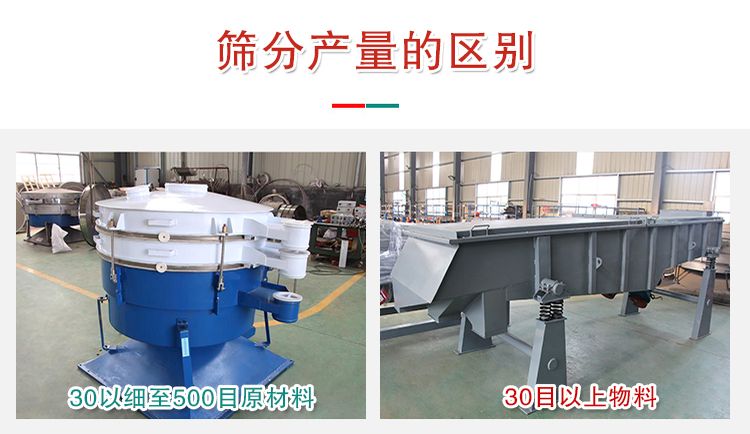 針對30目以粗上物料而言,振動篩和搖擺篩產(chǎn)量基本相同,對30以細(xì)至500目原材料來說,搖擺篩的生產(chǎn)量則大大高過振動篩,一般為振動篩的5—10倍。