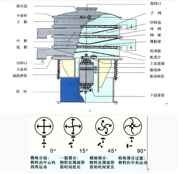 旋振篩是由直立式電機(jī)作激振源,電機(jī)上、下兩端安裝有偏心重錘,將電機(jī)的旋轉(zhuǎn)運(yùn)動(dòng)轉(zhuǎn)變?yōu)樗?、垂直、傾斜的三次元運(yùn)動(dòng),再把這個(gè)運(yùn)動(dòng)傳遞給篩面。通過(guò)調(diào)節(jié)上、下兩端的相位角,可以改變物料在篩面上的運(yùn)動(dòng)軌跡,通過(guò)增減振動(dòng)電機(jī)上下兩端的偏心重錘配重塊重量可以增加和減少震動(dòng)幅度。