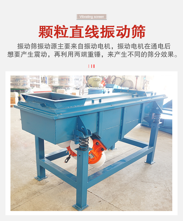 顆粒直線振動篩振動源主要來自振動電機(jī),振動電機(jī)在通電后想要產(chǎn)生震動,再利用兩端重錘,來產(chǎn)生不同的篩分效果。