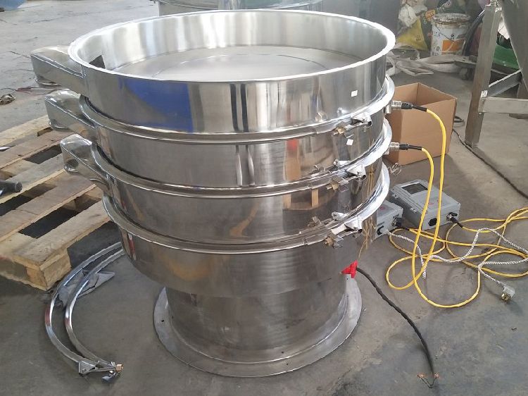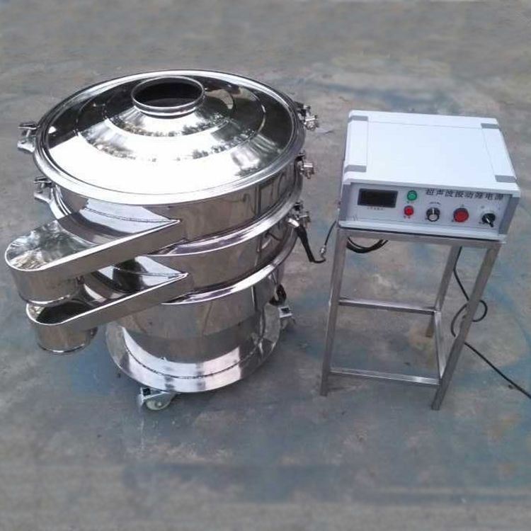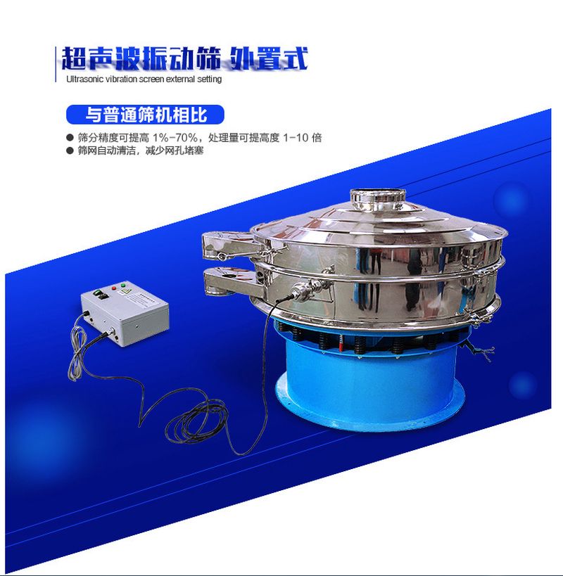 超聲波振動(dòng)篩是將220V、50Hz或110V、60Hz電能轉(zhuǎn)化為36KHz的高頻電能,輸入超聲換能器,將其變成36KHz機(jī)械振動(dòng),產(chǎn)生的功率超聲波使篩網(wǎng)作高頻振動(dòng)。篩網(wǎng)上的物料在作低頻旋振運(yùn)動(dòng)的同時(shí),疊加上超聲振動(dòng),既可防止網(wǎng)孔堵塞,又可使篩分機(jī)提高產(chǎn)量和質(zhì)量,從而達(dá)到快速篩分和清網(wǎng)的目的,使超微細(xì)粉篩分成為易事。該系統(tǒng)在傳統(tǒng)的振動(dòng)篩基礎(chǔ)上在篩網(wǎng)上引入一個(gè)低振幅、高頻率的超聲振動(dòng)波(機(jī)械波),以改變超微細(xì)分體的篩分性能。特別適合高附加值精細(xì)分體的用戶使用。