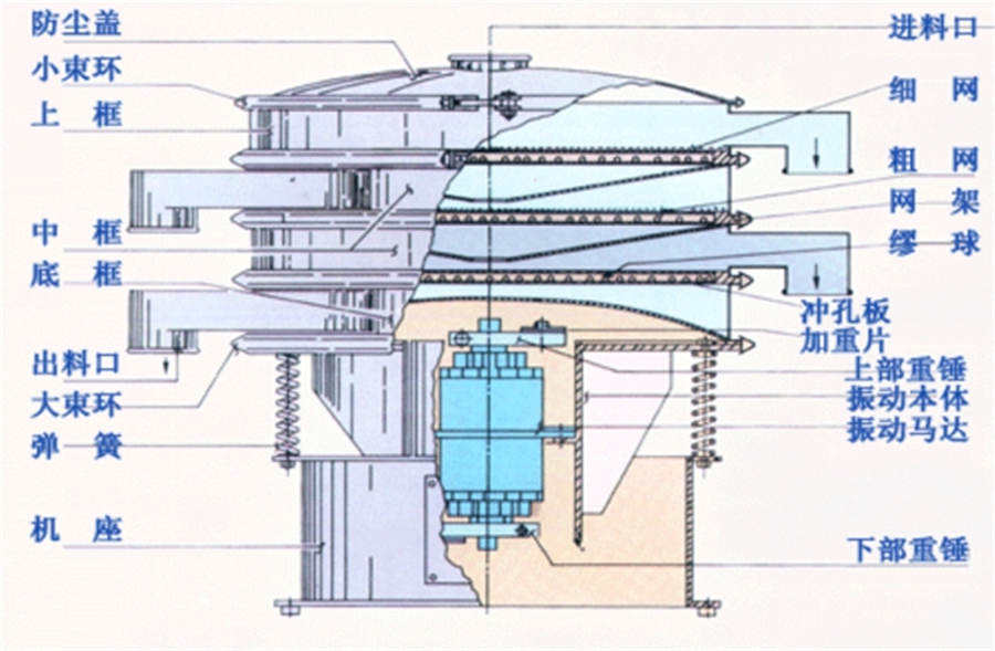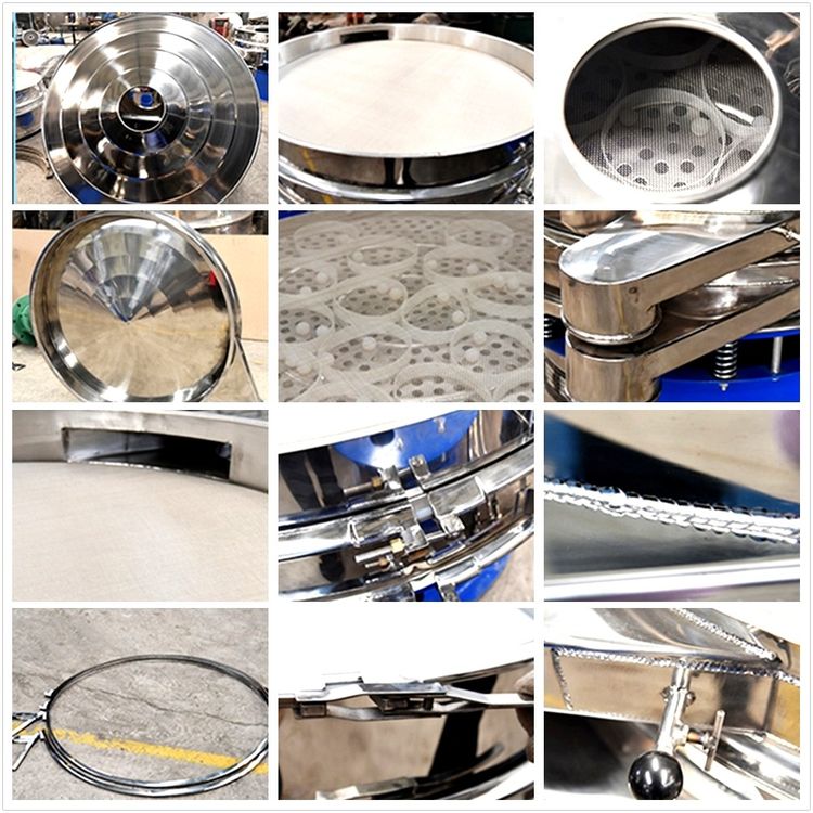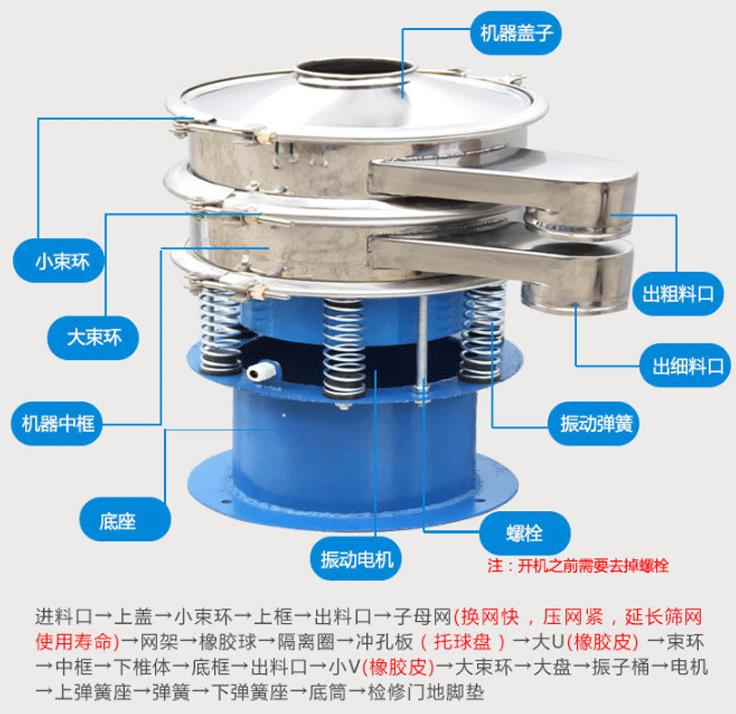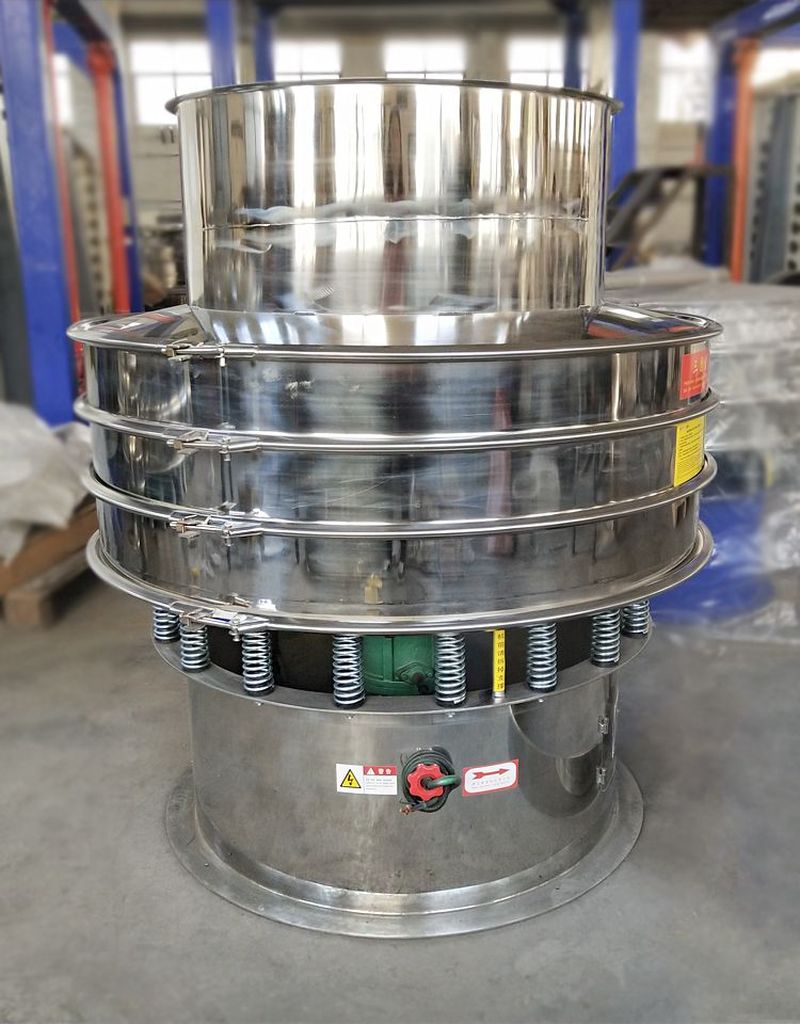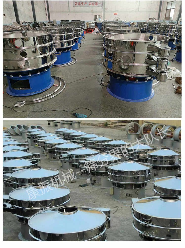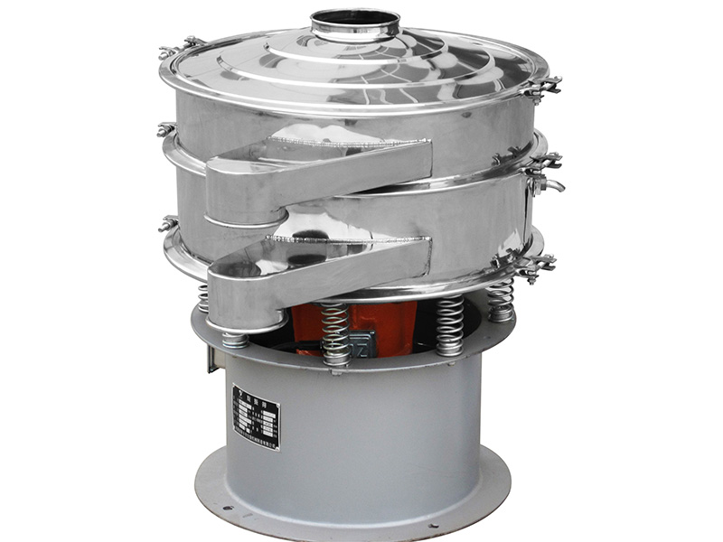 旋振篩是一種高精度細粉篩分機械,其噪音低、效率高,快速換網只需3-5分鐘,全封閉結構,適用于粒、粉、粘液等物料的篩分過濾。旋振篩是由直立式振動電機作激振源,電機上、下兩端安裝有偏心重錘,將電機的旋轉運動轉變?yōu)樗健⒋怪?、傾斜的三次元運動,再把這個運動傳遞給篩面。調節(jié)電機上、下兩端的相位角,可以改變物料在篩面上的運動軌跡。
