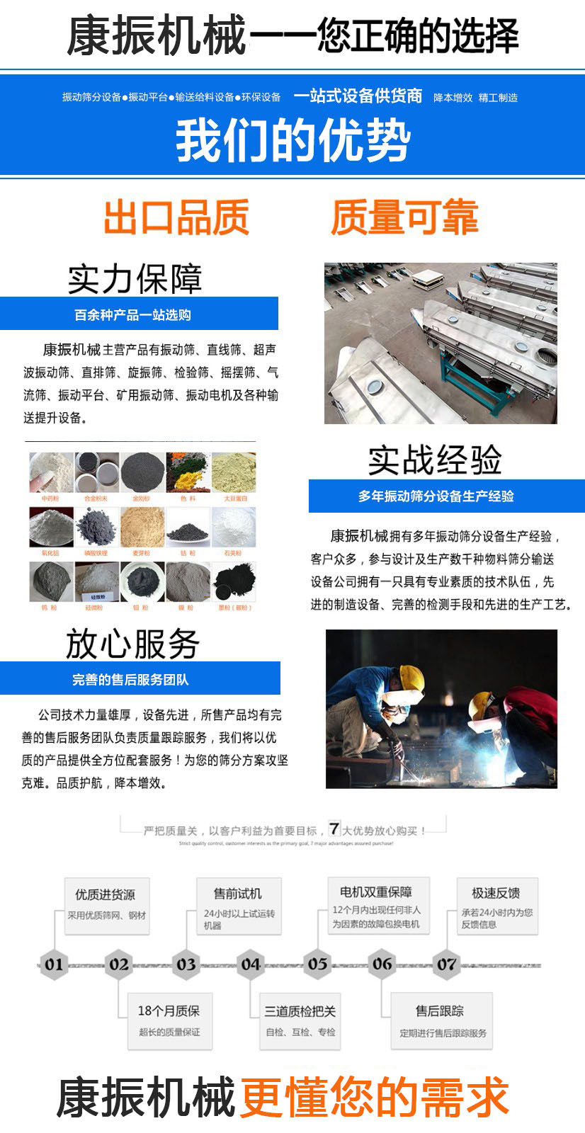 7、進(jìn)料方式多樣化、占用空間小,投資成本降低、運(yùn)轉(zhuǎn)平穩(wěn)可靠、篩分效率高、產(chǎn)量大。