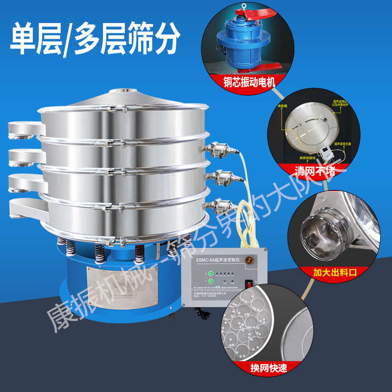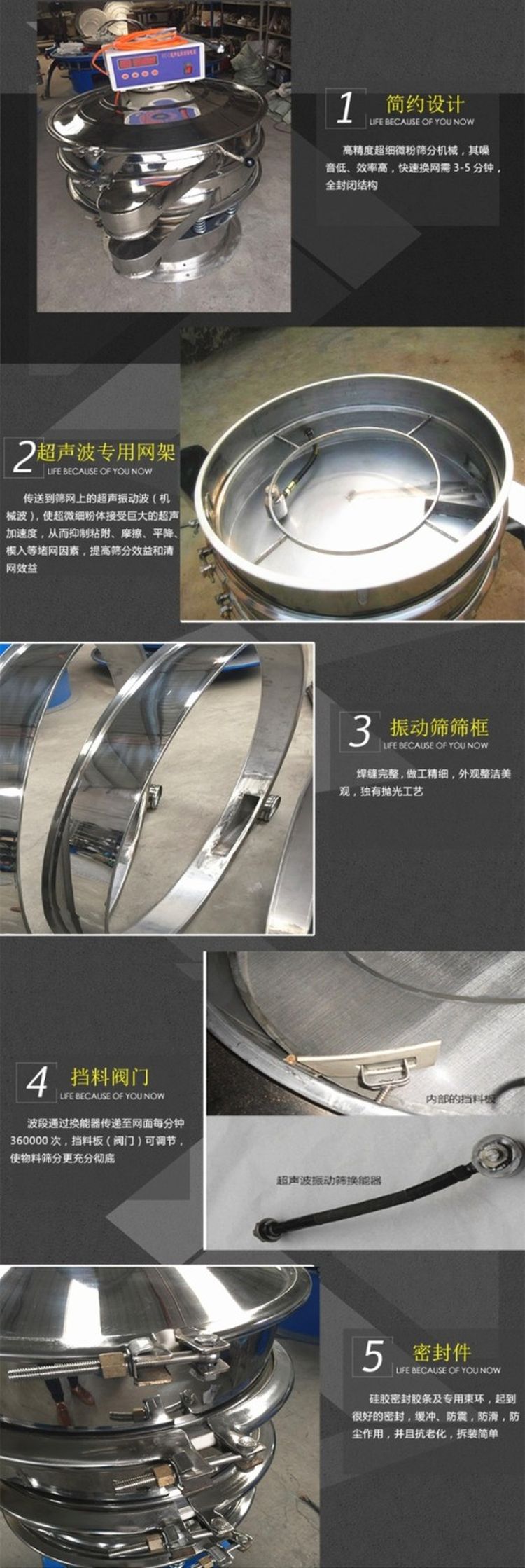 超聲波振動篩是將220V、50Hz或110V、60Hz電能轉(zhuǎn)化為36KHz的高頻電能,輸入超聲換能器,將其變成36KHz機械振動,產(chǎn)生的功率超聲波使篩網(wǎng)作高頻振動。篩網(wǎng)上的物料在作低頻旋振運動的同時,疊加上超聲振動,既可防止網(wǎng)孔堵塞,又可使篩分機提高產(chǎn)量和質(zhì)量,從而達到快速篩分和清網(wǎng)的目的,使超微細粉篩分成為易事。該系統(tǒng)在傳統(tǒng)的振動篩基礎(chǔ)上在篩網(wǎng)上引入一個低振幅、高頻率的超聲振動波(機械波),以改變超微細分體的篩分性能。特別適合高附加值精細分體的用戶使用。