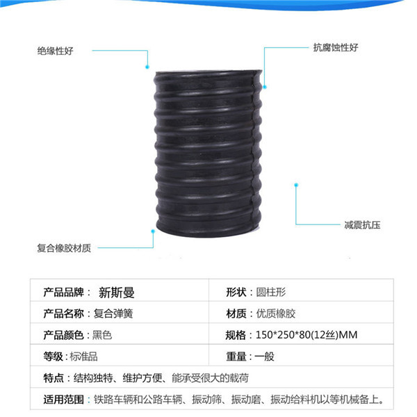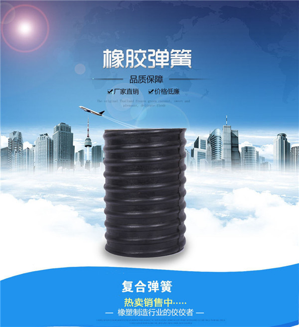 復(fù)合彈簧:是由金屬螺旋彈簧和橡膠復(fù)合在一起的園筒狀彈性體。該產(chǎn)品優(yōu)于金屬?gòu)椈?,具有抗腐蝕性好、壽命長(zhǎng)等優(yōu)點(diǎn),與其它彈簧相比,減振能力強(qiáng),緩沖效果好。