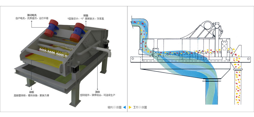 脫水篩又稱(chēng)高頻脫水篩,通過(guò)激振力改變了礦漿表面的水張力,漿水透過(guò)篩網(wǎng)成為篩下物,而微細(xì)物料被篩網(wǎng)阻隔形成濾層受振動(dòng)力影響向前運(yùn)動(dòng)排出。脫水篩主要用于選礦行業(yè)的尾礦脫水、選煤廠(chǎng)的煤泥脫水、水洗石英砂脫水和陶瓷泥漿脫水,以及電力、制糖、制鹽等工業(yè)部門(mén)對(duì)中細(xì)顆粒物料進(jìn)行干濕式分級(jí)、脫水、脫介和脫泥。