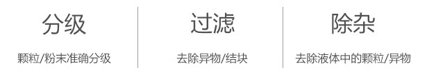 任何顆粒、粉末、粘液一定范圍內(nèi)均可篩選。篩分細(xì)至500目或0.028mm, 過濾小可至5微米。分級(jí)篩選,可篩一至五層篩網(wǎng),能同時(shí)進(jìn)行二至六個(gè)等級(jí)的分選或過濾。